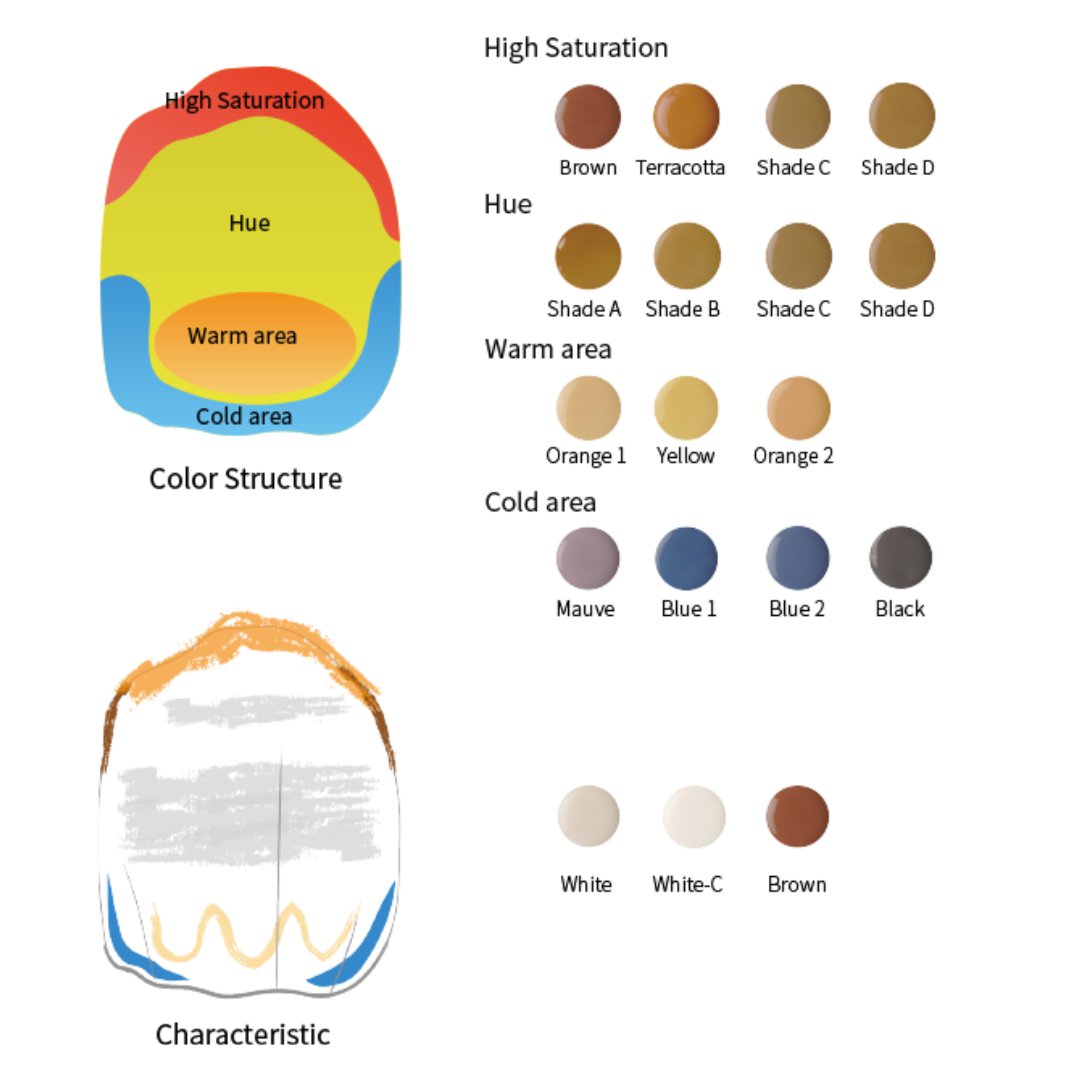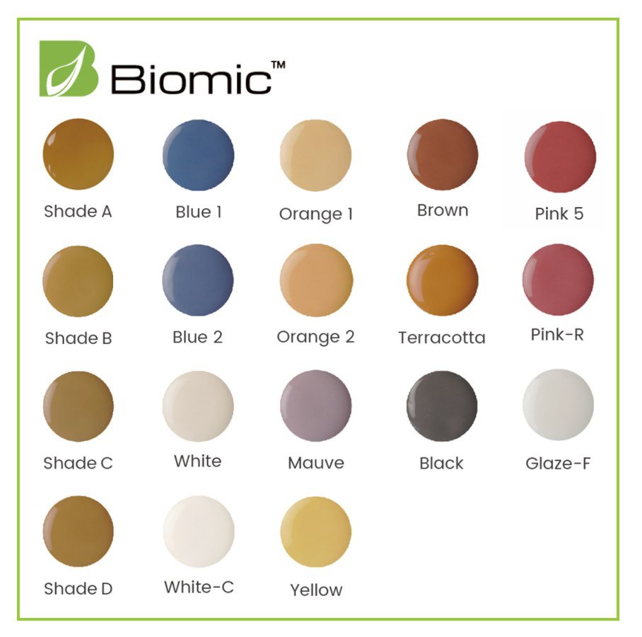Teinte Biomic | Glaze-F, Black, Brown, Mauve, Shade A, Shade B, Shade C, Shade D, Terracotta, White, Yellow, Blue 1, Blue 2, Orange 1, Orange 2, Pink 5, White-C, Pink-R |