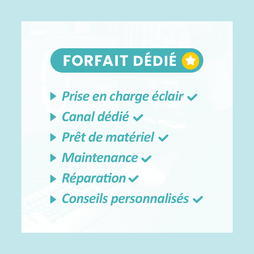 Bénéficiez d’une prise en charge prioritaire (< 1h ouvré max), d’un prêt de matériel, de la maintenance incluse, de 4h de conseil personnalisées et de services informatiques avancés.